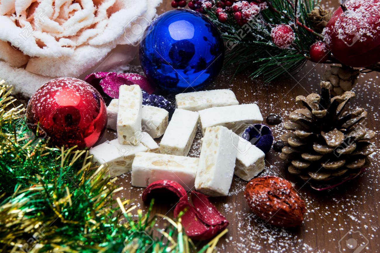 Nougat Espagnol Douce Traditionnelle Pour Noël Amande Douce Nougat Fond Sombre