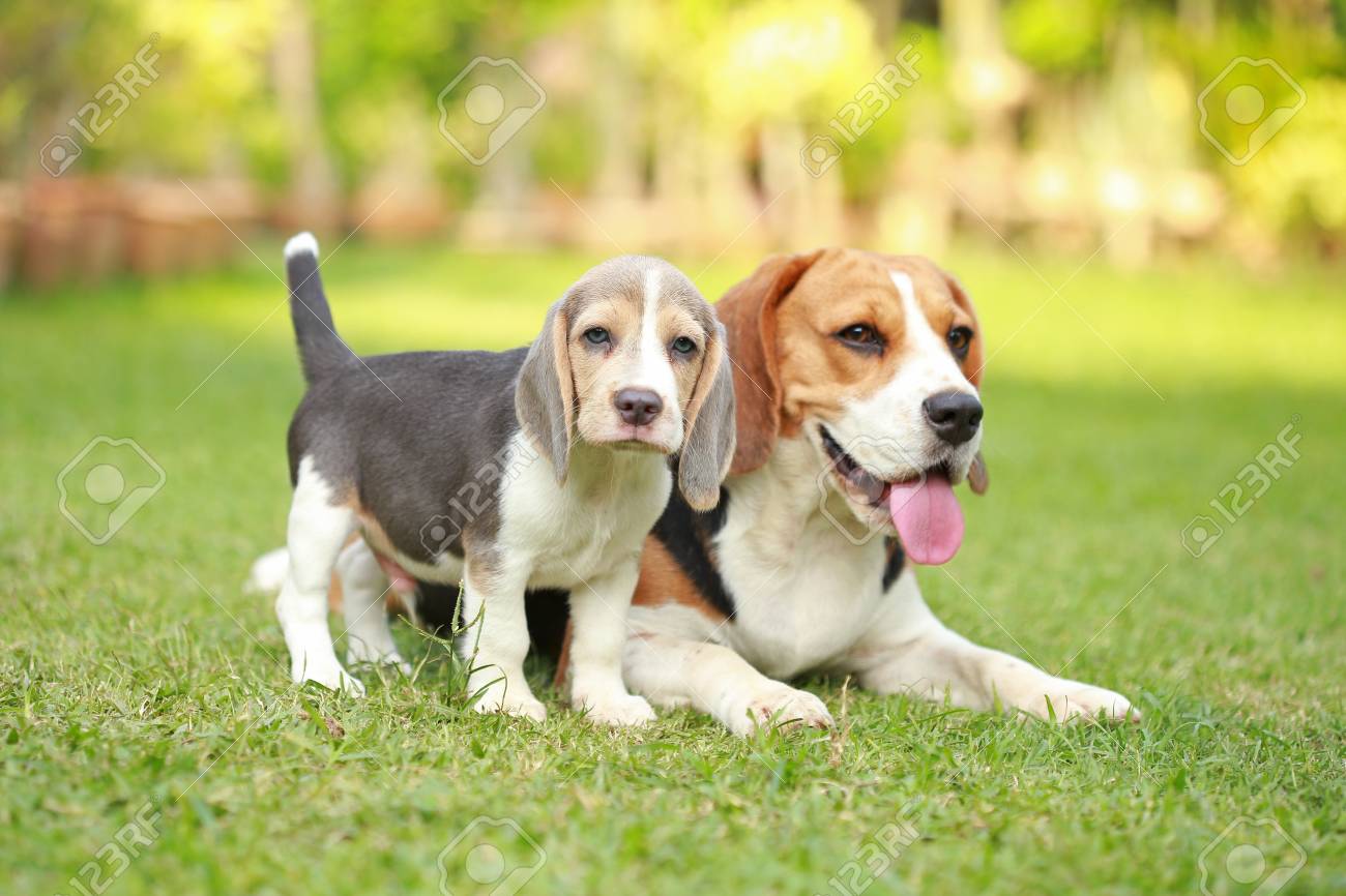 Purebred Adult And Puppy Beagle Dog Are Playing In Lawn